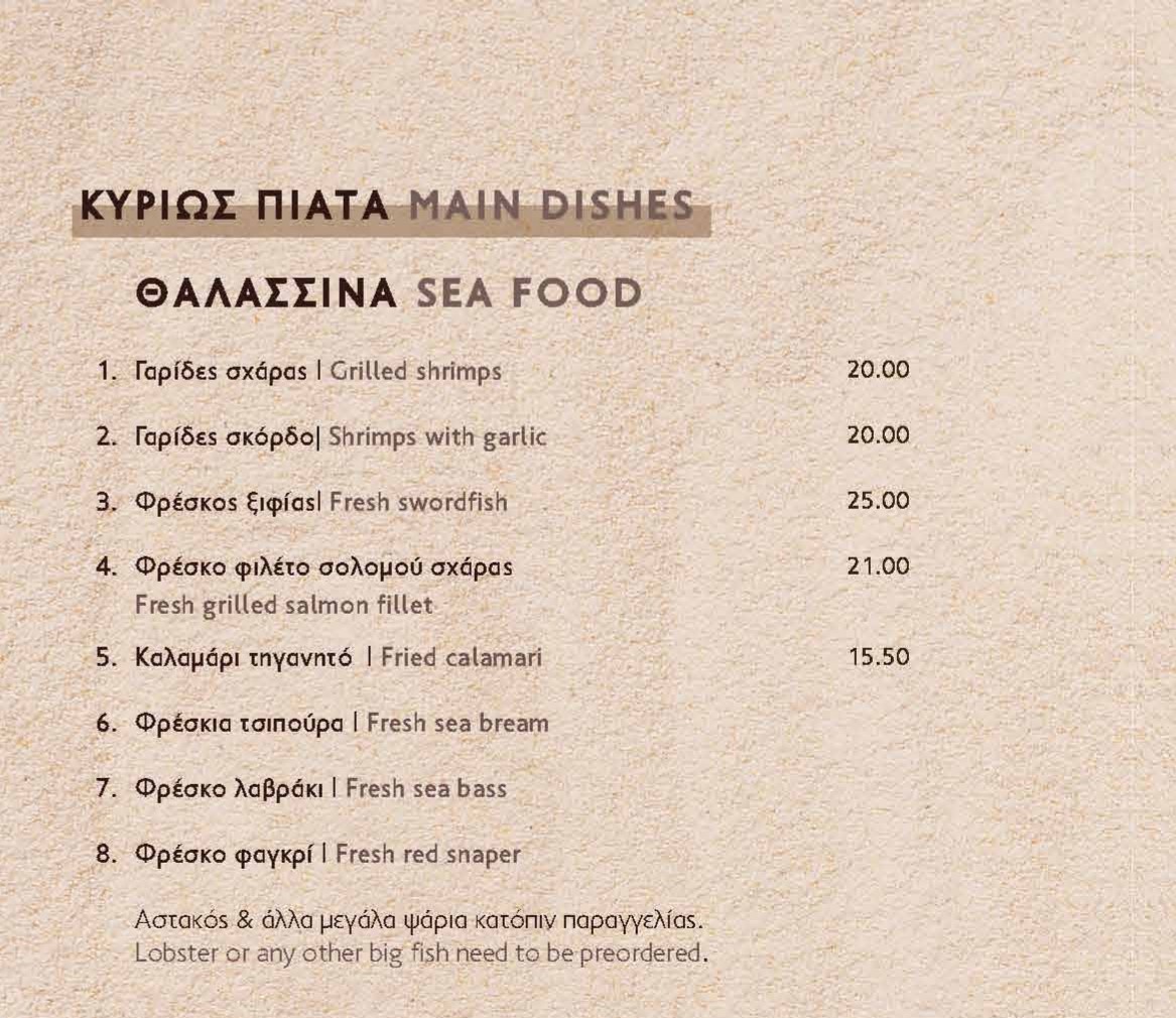 Κυρίως πιάτα(Θαλασσινά)|Main Dishes(Sea food)